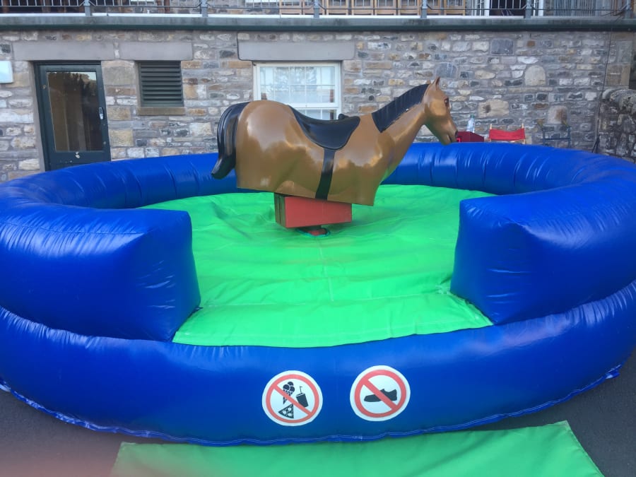 The rodeo horse, controlled by Nbk trained staff, Will let the brave jockey in training mount, slowly starting there ride, then once the rider gets used to the bucking, spinning and twisting, we will increase the speed until the inevitable happens and you land on the soft inflatable bed.